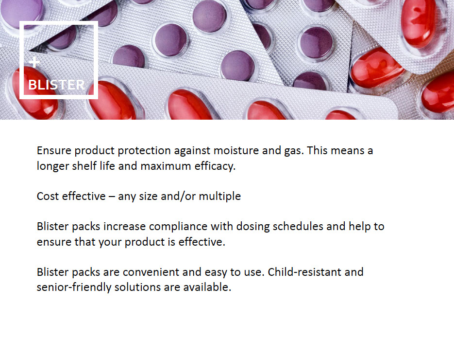 Blister packs increase compliance with dosing schedules and help to ensure that your product is effective.